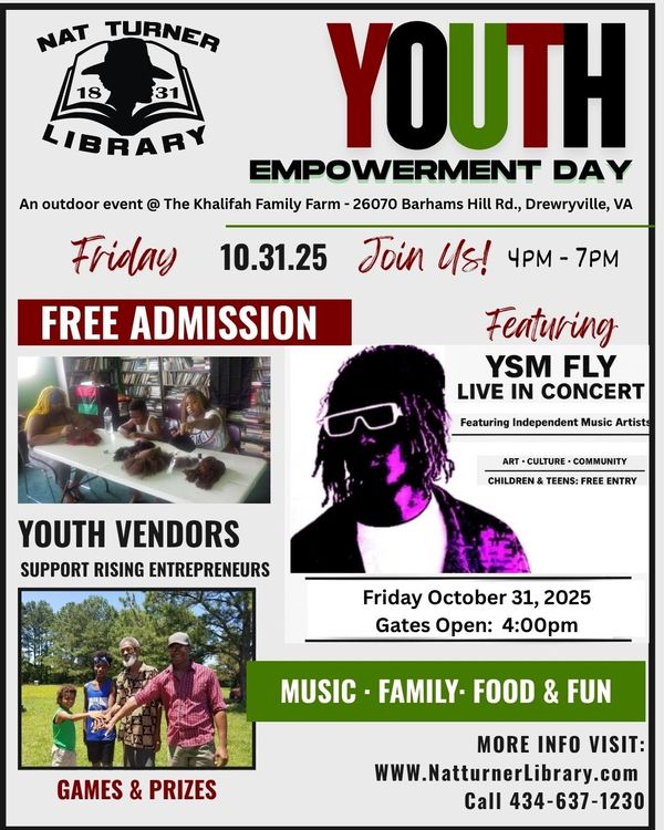 YOUTH TICKET (Ages 13-20). Join us for the 194th Martyrdom Memorial paying homage to General Nat Turner on his transition to the Ancestral realm on November 11, 1831. Youth Ticket Includes: Nat Turner Mobile War Trail Tour; full day's event and plant-based dinner. Cultural music and drum, African Market place vendors.